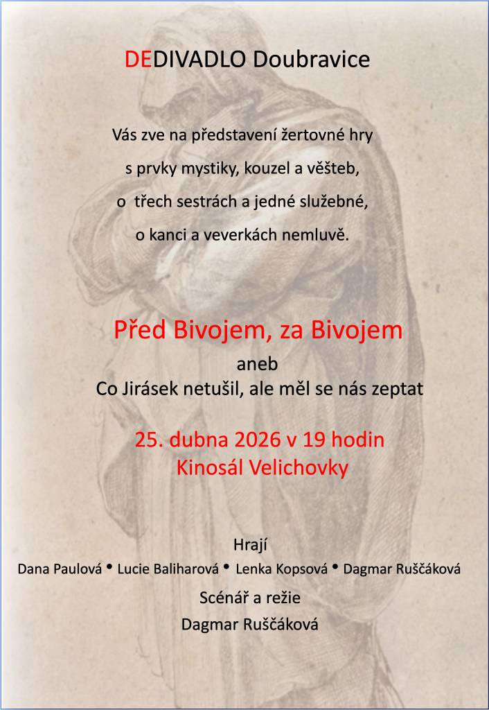 Srdečně vás zveme na jedinečný večer plný humoru, napětí i nečekaných zvratů! Přijďte si užít originální divadelní představení „Před Bivojem, za Bivojem“ a nechte se vtáhnout do děje, který pobaví i překvapí.