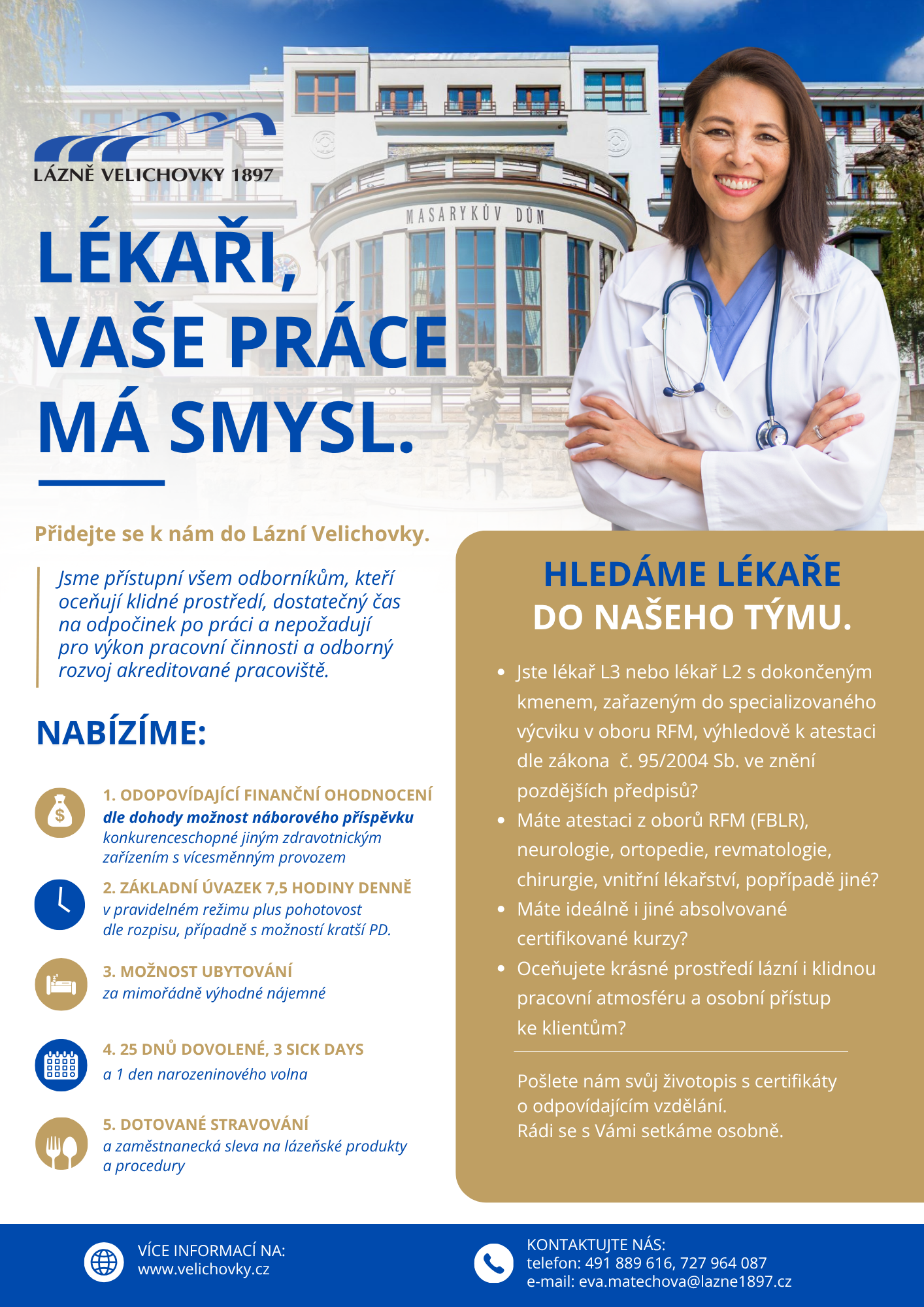 Lázně Velichovky rozšiřují svůj tým a hledají nové lékaře. Nabízíme klidné pracovní prostředí, individuální přístup ke klientům a odpovídající finanční ohodnocení včetně zajímavých benefitů.