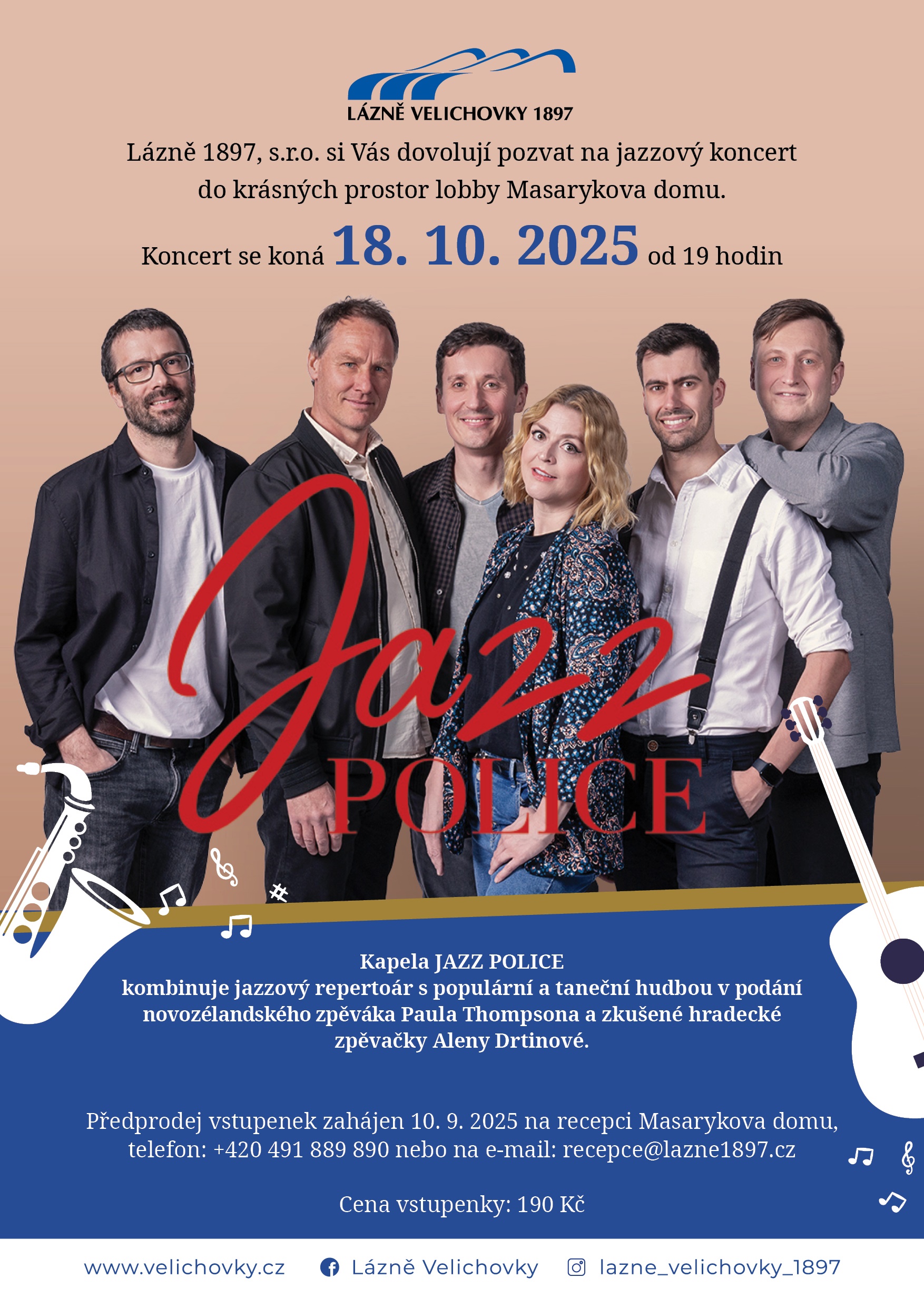 O energickou atmosféru se postará kapela JAZZ POLICE – hudební formace, která s lehkostí propojuje jazz s tanečními melodiemi. Zazní známé skladby v originálním podání charismatického novozélandského zpěváka Paula Thompsona a skvělé české zpěvačky Aleny Drtinové.