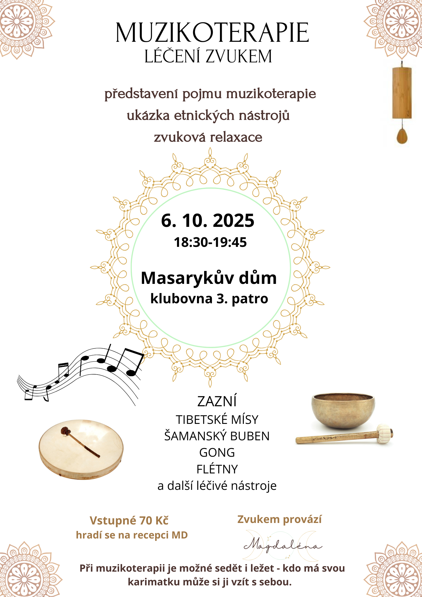Zveme vás na jedinečný večer plný léčivých tónů a hluboké relaxace. Objevte sílu muzikoterapie, která harmonizuje tělo i mysl prostřednictvím zvukových vibrací.