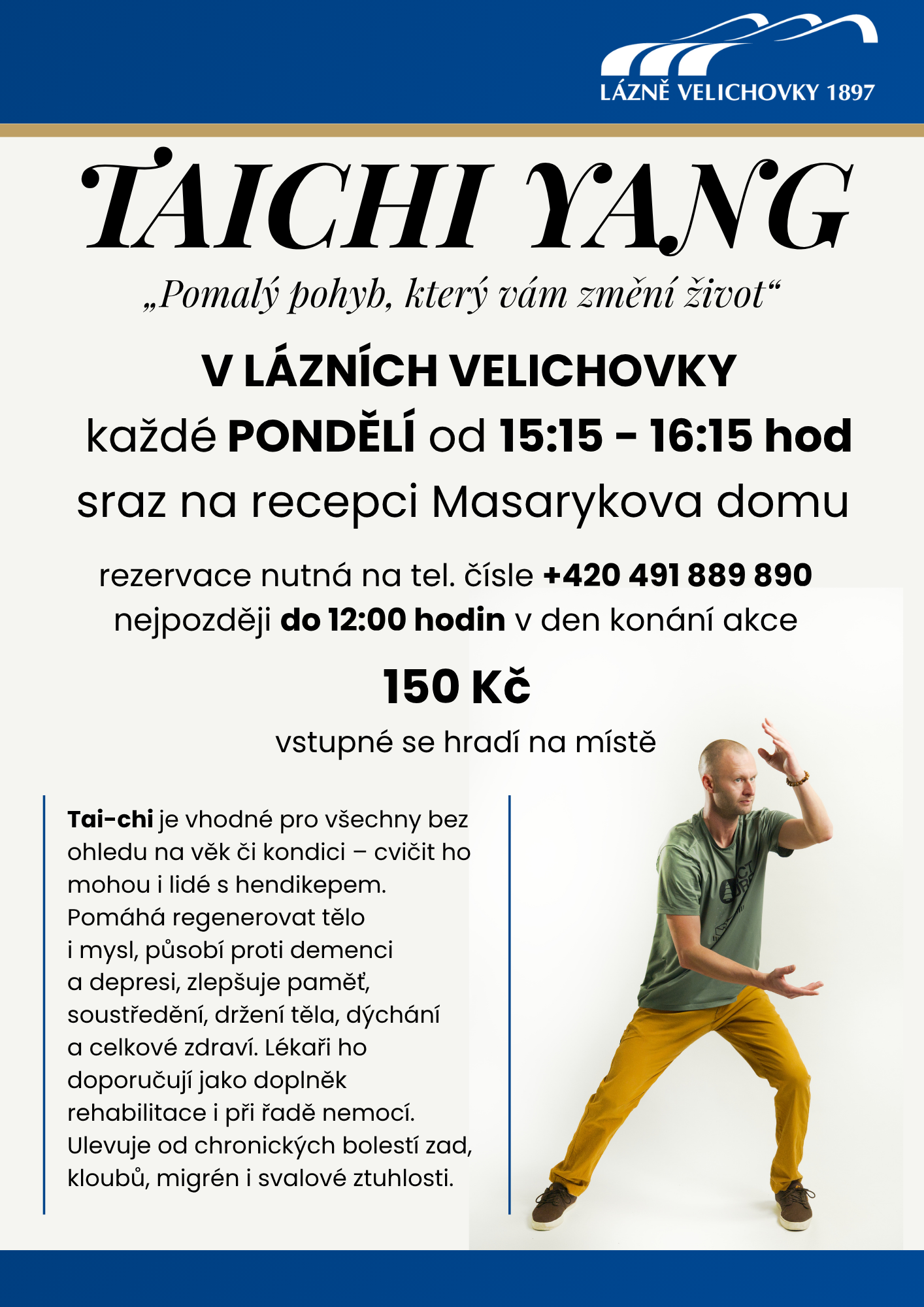 Tai-chi pomáhá regenerovat organismus, ulevuje od chronických bolestí zad, kloubů, migrén a svalového napětí. Podporuje paměť, soustředění, držení těla i dýchání. Lékaři ho doporučují jako účinný doplněk rehabilitace a prevenci řady civilizačních nemocí – včetně deprese a demence.