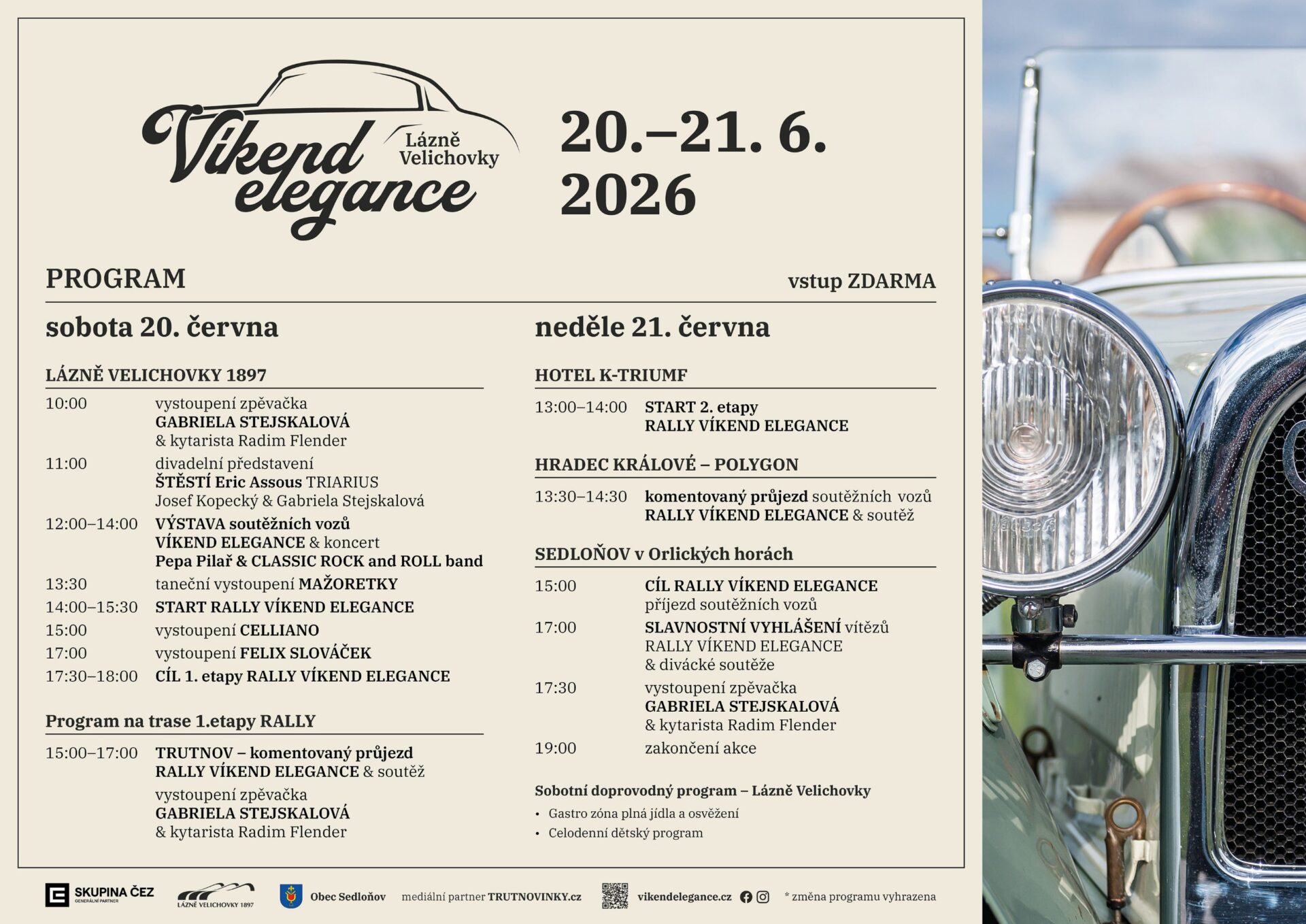 S potěšením oznamujeme, že Lázně Velichovky budou i letos součástí oblíbené akce Víkend elegance, která se uskuteční ve dnech 19. – 21. června 2026 a přináší jedinečnou podívanou na historická i luxusní vozidla.